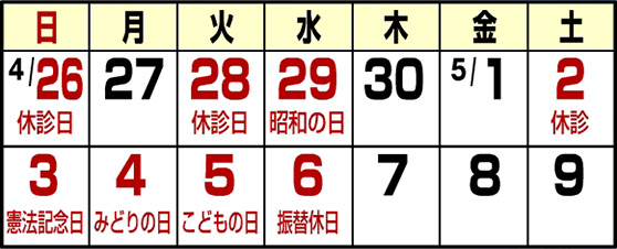 5月2日(土)~5月6日(水)まで休診とさせていただきます。